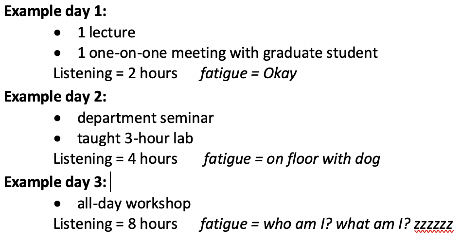 So how successful have I been? Moderately. While I have control over some aspects of my schedule, I don’t over others. I schedule my one-on-one meetings with my research assistants on days that I don’t have a lot of other meetings. If I’m teaching a 3-hour lab, sometimes it’s just impossible for me to have no other teaching or meetings that day. But I am considering restructuring my lab activities so that I don’t need to be ‘on’ the whole time. I’ve also started talking with my department head about my effort to limit my daily meetings; this involves educating him on why listening fatigue is different for me than for hearing faculty. Had I been more savvy, I might have negotiated a listening limit when I was hired. Take note of this, future academics!