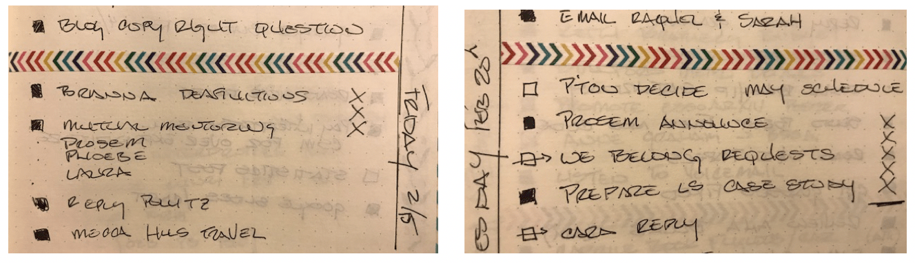Actually, I didn’t track this much detail—I just made marks in my bullet journal for each hour and then noted whether this was manageable. Below are two example pages. For the day on the left, the 3 Xs represent 3 hours of listening and this was an OK day. The image on the right is from another day that month. The horizontal line below the Xs means that I was on the floor with the dog that evening after 5 hours of listening.